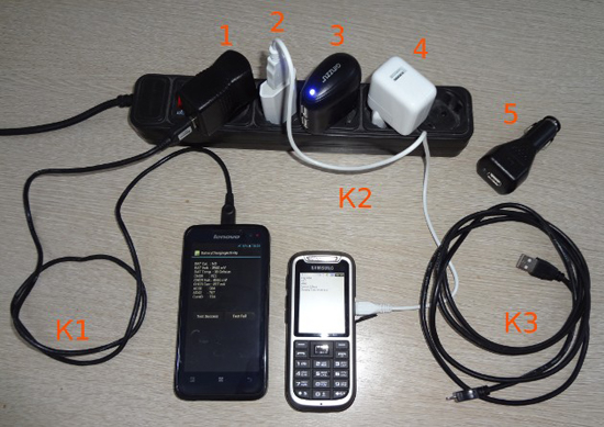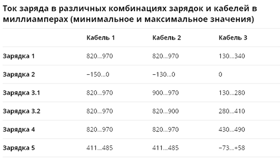 Я взял несколько зарядок с выходом USB и, соответственно, несколько кабелей вида USB → microUSB. Подключив их в различных сочетаниях к своему аппарату, для каждого сочетания определил минимальный и максимальный ток зарядки (он немного плавает во времени) и записал их в таблицу.