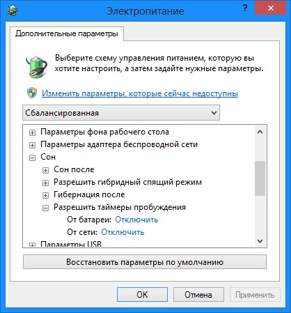 В окне изменения дополнительных параметров перейдите в раздел Сон и отключите таймеры пробуждения.
