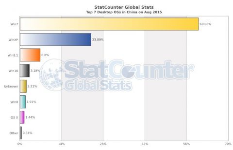 Если в США новая операционная система Windows 10 вышла уже на 4-е место в сегменте платформ для настольных ПК, то в Китае, известном своей любовью к пиратским продуктам, она пока не так популярна. Данные от StatCounter за август показывают, что её доля в самой населённой стране мира составляет сейчас 3,18%, а лидирует Windows 7 с долей рынка 60,03%, значительная часть которых относится к нелицензионным копиям системы.