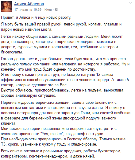 Як повідомляє "Країна", киянка Аліса Абасова написала оригінальний пост в "Фейсбуці", який свідчив, що дівчина шукає роботу.