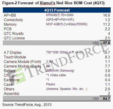 Китайская компания Xiaomi продает свой смартфон Red Rice с 4,7-дюймовым HD-экраном за $130. Специалисты TrendForce подсчитали, во сколько обойдутся комплектующие для устройства (без учета других трат). Самым дорогим элементом оказался дисплей — он обходится в $18,7, это около 22% от общей суммы.