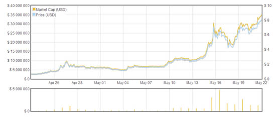 Всего за один месяц с 22 апреля по 22 мая 2014 года криптовалюта Darkcoin подорожала с $0,69 до $8,13, то есть почти в 12 раз. Этот бурный рост может свидетельствовать о том, что на рынке ощущается нехватка по-настоящему анонимных платёжных средств. Именно так позиционирует себя Darkcoin — один из многочисленных форков Bitcoin.