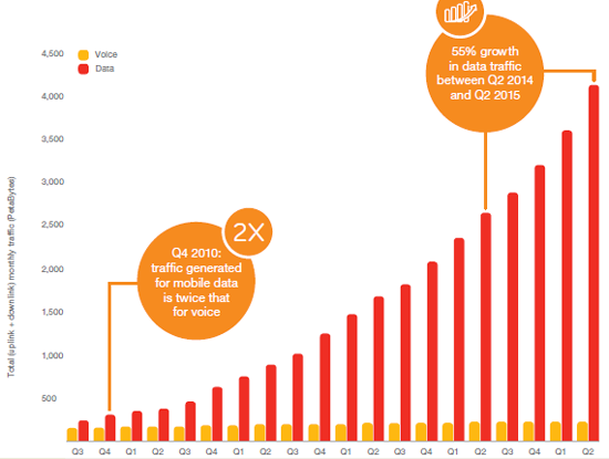 Мобільний трафік за останній рік зріс на 55%, сьогодні кожного місяця користувачі мобільних пристроїв у всьому світі генерують більше 4 ексабайт (4 млн терабайт) трафіку.