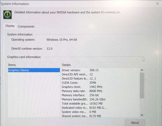Согласно приведённому изображению, мобильная версия GeForce GTX 1070 получит 8 Гбайт локальной памяти GDDR5 (8 Гбит/с), доступ к которой обеспечит 256-разрядная шина RAM ядра GP104 (ревизия GPU A1, номер не определён). Количество блоков рендеринга программа определила верно (64 ед.), а вот число текстурных блоков завышено: в соответствии с архитектурой карт Pascal, их должно быть ни много ни мало 128 шт. Новинка также характеризуется пониженной частотой ядра в 1443—1645 МГц (у GTX 1070 Founders Edition — 1506–1683 МГц) и пропускной способностью памяти в 256 Гбайт/с.