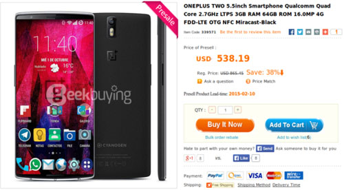 Смартфон OnePlus Two уже был замечен на сайте китайского ритейлера Coolicool, а недавно информацию о новинке опубликовал ещё один местный онлайн-магазин Geekbuying.