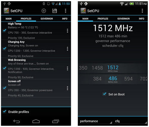 Принцип действия SetCPU заключается в использовании профилей процессора. Это может быть единая установка с минимальной (как вариант — максимальной) частотой «камня» вне зависимости от ситуации. Или настройка профиля, который действует в зависимости от ситуации. Например, повышает частоту вплоть до предела соразмерно росту нагрузки. Любопытный баланс программы состоит в том, что она, с одной стороны, позволяет потенциально добиться более долгой работы смартфона, а с другой — в «профильных» случаях максимально задействует производительность «железа».