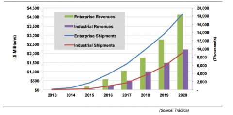 Как и в потребительском секторе, в корпоративном и промышленном сегментах носимые устройства на данный момент ещё не стали достаточно популярными. Согласно отчёту, в 2013 году сотрудниками предприятий использовалось около 166 000 носимых девайсов. Аналитики Tractica уверены, что к 2020 году этот показатель вырастет до 27,5 миллиона устройств.