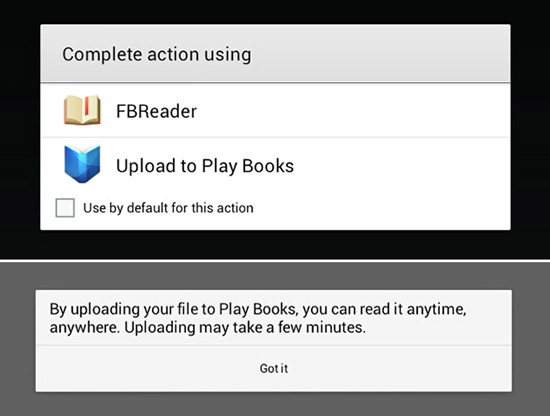 Google выпустила обновление приложения Google Play Books для платформы Android, которое позволит пользователю загружать книги в формате PDF и EPUB в собственную библиотеку с Android-смартфона или планшета, не заходя на сайт Google. Достаточно открыть книгу в любом файловом менеджере или электронном письме и выбрать новую опцию «Upload to Play Books» (загрузить в Play Books).