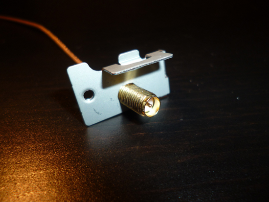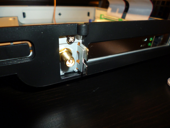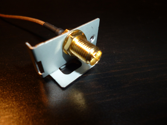 В корпусе имеется штатное место для установки одной антенны (точнее, отверстие для установки одного пигтейла), поскольку меня это не устраивало, и предполагалась установка двух антенн, пришлось «колхозить». Но в итоге труды мои вознаградились и получилось всё очень даже пристойно: в корпусе присутствует заглушка, которая крепится одним винтом и одной защёлкой и фиксирует установленную в «трюме» плату расширения. В ней я просверлил отверстие Ø 6 мм, слегка подправил его надфилями для снятия заусенец, острых кромок и придания плоской формы одной из сторон — формирование ответной части разъёма RP-SMA, после чего пигтейл встал как влитой. Результат на фото ниже.