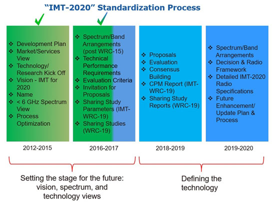 Работы осуществляются в рамках программы IMT-2020. Это обозначение выбрано как добавление к существующему семейству глобальных стандартов МСЭ для систем подвижной электросвязи IMT-2000 и IMT-Advanced, которые служат основой для всех сетей соответственно третьего (3G) и четвёртого (4G) поколений.