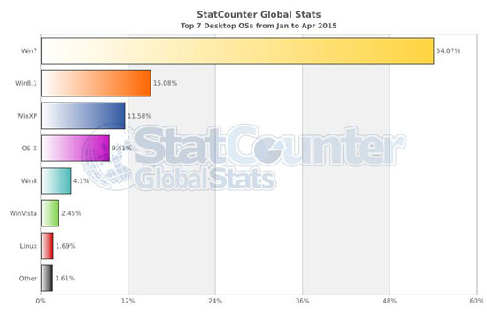 Информация, предоставленная аналитическим агентством StatCounter, указывает на то, что операционной системой Windows 7 пользуются не менее 54,07 процента персональных компьютеров по всему миру. Другими словами, каждый второй ПК в мире работает на базе Windows 7. При этом агентство отмечает, что доля Windows 7 в мире существенно возросла в 2015 году, даже несмотря на то, что первый доступный для загрузки на домашние компьютеры билд Windows 10 был представлен в октябре 2014 года.