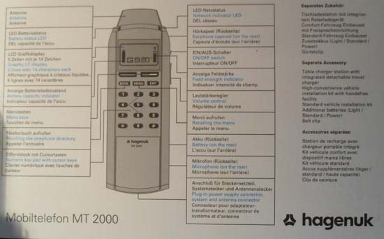 Это был аппарат Hagenuk MT-2000. Устройство было разработано и производилось в Дании. Моноблочный форм-фактор, цифровая клавиатура и монохромный дисплей — вот всё, что мог предложить телефон покупателям. Hagenuk MT-2000 поддерживал работу в сотовых сетях GSM.