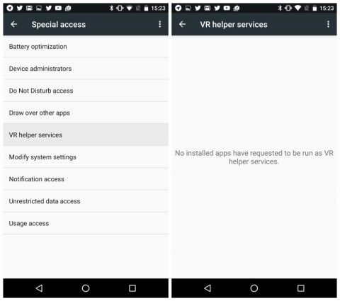 Тестовые версии прошивок зачастую содержат в себе интересные функции, которые не всегда появляются в публичных релизах. Например, в последней версии Android N нашли встроенную поддержку режима виртуальной реальности. Новый пункт меню, активирующий эту функцию, находится в Настройках → Приложения → Настройки (иконка шестерёнки сверху) → Специальный доступ → VR Helper Services. Вместе с этим во второй версии Android N Developer Preview появился новый API доступа к VR-функциональности.
