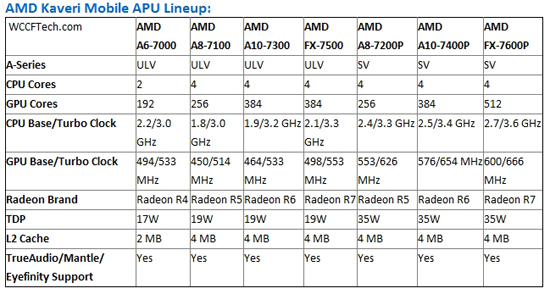 В распоряжении сетевых источников оказались данные о характеристиках ряда процессоров AMD Kaveri, предназначенных для портативных компьютеров.