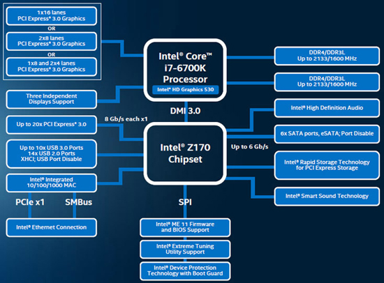 Встроенный корневой комплекс PCI Express 3.0 с быстродействием 8 млрд передач в секунду включает 16 линий, которые можно сконфигурировать для работы в режимах 1×16, 2×8 или 1×8 и 2×4. Интегрированный графический процессор Intel HD Graphics 530 поддерживает API Microsoft DirectX 12 и дисплеи разрешением Ultra HD 4K. Частота Intel HD Graphics 530 достигает 1150 МГц.