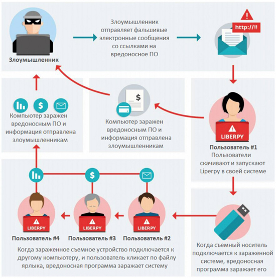 Полученные данные отправлялись на удаленный контролирующий сервер злоумышленников, который использовался для хранения собранной информации. Для заражения в рамках «Операции Liberpy» использовались фишинговые сообщения электронной почты, замаскированные под уведомления о почтовой доставке. Письма содержали ссылки на загрузку вредоносного ПО.