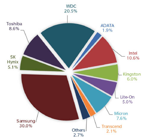 Если рассматривать только рынок SSD, то за первый квартал в мире было реализовано 39,783 млн накопителей. Лидером является Samsung, которая заняла 30% рынка. За ней следует WD с 20,5%, а замыкает тройку Intel с 10,6%.