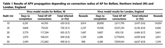 Впрочем, авторы отчитались в успешности лабораторного опыта по заражению соседних точек доступа — и продолжили эксперимент, перейдя от практического «доказательства» возможности существования подобного вируса к изучению скорости его распространения в реальных городских условиях. Для компьютерной симуляции они использовали информацию о WiFi-хотспотах в Белфасте и Лондоне.