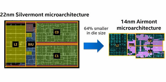 На форуме разработчиков Intel Developers Forum 2015, открывшемся 8 апреля в китайском городе Шэньчжэнь, корпорация Intel раскрыла один из наиболее любопытных секретов 14-нанометровой процессорной архитектуры Airmont, которая идёт на смену 22-нанометровой Silvermont. Оказывается, в новой архитектуре площадь на кристалле, занимаемая вычислительными ядрами x86, сократилась на 64 %.