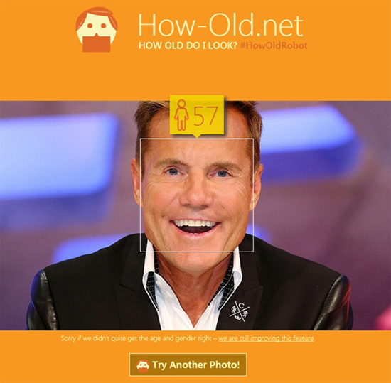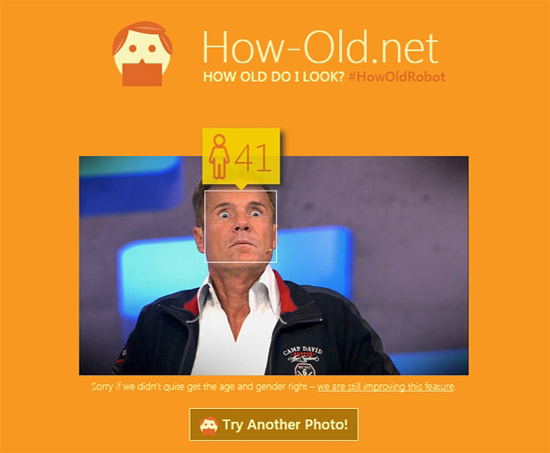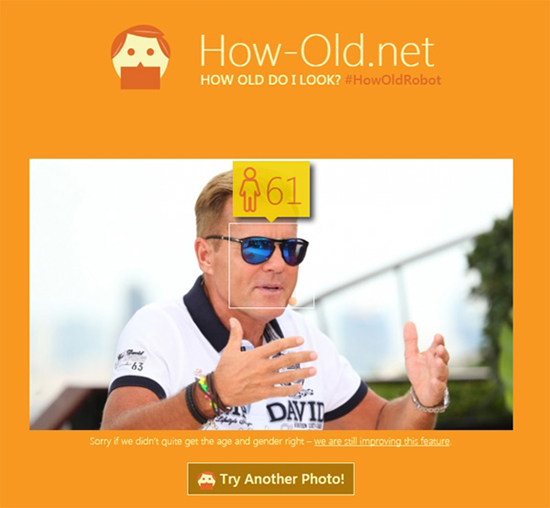 В качестве эксперимента на сайт были загружены взятые из Интернета недавние фотографии одного и того же человека — известного в Европе деятеля шоу-бизнеса, которому в нынешнем году исполнился 61 год. С первым изображением робот справился успешно, «скинув» музыканту лишь четыре года, чем можно пренебречь. А вот на втором кадре он «споткнулся», допустив погрешность в целых 20 лет. Однако уже на третьем фото How-Old.net «отыгрался» — несмотря на то, что объект съёмки был запечатлён в солнцезащитных очках, его возраст был установлен максимально точно.