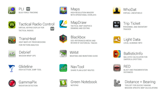 Перелік спеціалізованих військових програм не завершується. Снайперам доступний балістичний калькулятор, солдати можуть ознайомитися з інструкціями до різної зброї через утиліту WAM. Спеціальний додаток спрощує брифінги, які можна проводити віддалено, програма Trip Ticket допоможе інвентаризувати амуніцію солдат. Додаток SmartTRIAGE стане незамінним при пораненнях, оскільки він показує на екрані тіло людини, і можна обрати пошкоджену частину простим тапом та вказати тип поранення. Смартфон виведе рекомендації щодо лікування.
