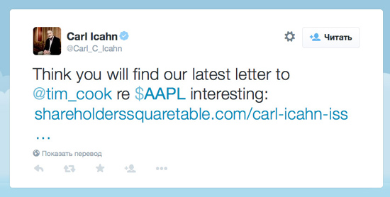 Сообщение в микроблоге Twitter, написанное в понедельник миллиардером и инвестором Карлом Айканом, спровоцировало рост капитализации Apple на 8 млрд долларов. Об этом сообщает издание MarketWatch.