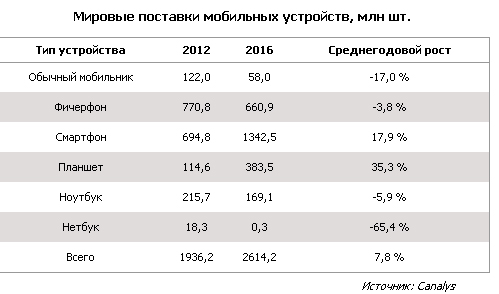 Сокращение поставок обычных мобильных телефонов - тенденция, которая наблюдается уже давно. Ожидается, что этот сегмент сократится со 122 млн до 58 млн устройств в период с 2012 по 2016 гг.