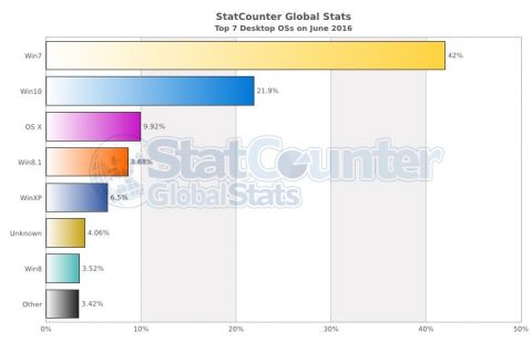 StatCounter показывает, что в июне темпы распространения Windows 10 выросли. Windows 7 лидирует, но быстро теряет пользователей. Её доля равна 42% против 21,9% у Windows 10. В июле прошлого года у Windows 7 было более 60% рынка.