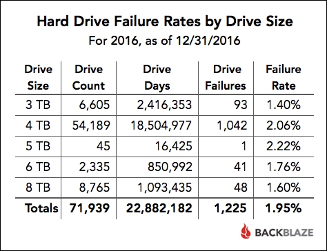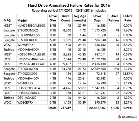 Занимающаяся хранением данных компания Backblaze опубликовала статистику надёжность жёстких дисков за последний квартал и за весь 2016 год, в которую вошли данные 71939 дисков. У компании есть ещё 1553 загрузочных диска, которые не вошли в эту статистику. Также сюда не включены диски для тестовых целей и модели, количество которых было меньше 45.