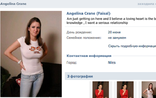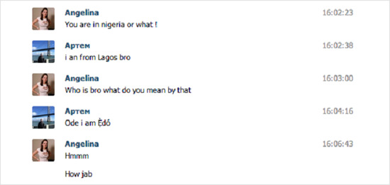 Мошенник выдавал себя за девушку с именем Анджелина Крейн (Angelina Crane), якобы американку, оказавшуюся в Нигерии, сообщает meduza.io.