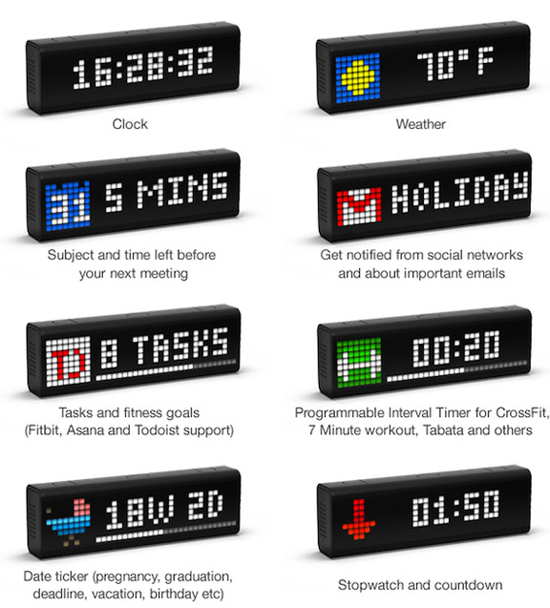 Дисплей LaMetric умеет отображать различную полезную информацию: оповещения из социальных сетей и почты, данные о состоянии погоды и даже вашего здоровья, благодаря синхронизации с приложениями вроде Google Calendar, CrossFit, IFTTT и другими. Это позволяет видеть на экране дисплея информацию о ваших достижениях в фитнесе, напоминания календаря и другую повседневную информацию. В устройство также встроены таймер, секундомер и множество других функций.