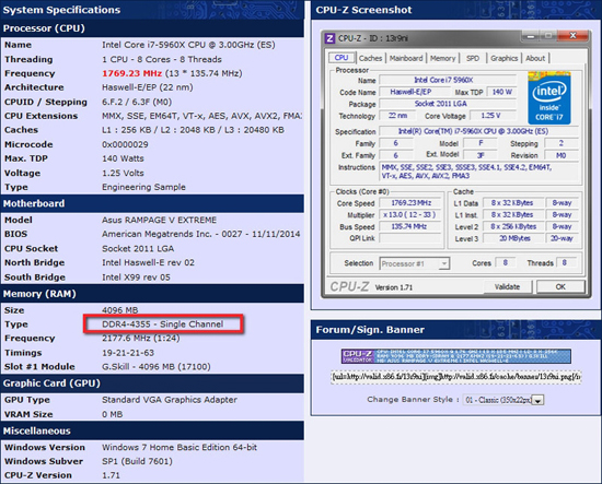 Сообщается, что в компьютере использовался один модуль памяти Ripjaws 4 ёмкостью 4 Гбайт. Эффективная частота достигла 4355 МГц, тайминги — 19-21-21-63.