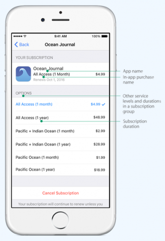 Компания Apple внесла некоторые изменения в политику App Store, позволив сторонним разработчикам предлагать автоматически возобновляемые подписки внутри iOS-приложений. Когда период подписки будет подходить к концу, то с карточки пользователя будет автоматически списываться сумма, необходимая для продления подписки на тот же срок. Так будет происходить до тех пор, пока пользователь не отключит подписку на предлагаемую услугу. Кроме того, разработчики теперь смогут предлагать пробный период с автоматическим продлением уже на платной основе.