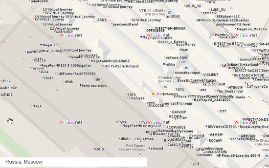 Какую информацию мы можем собрать на основании списка сетей? Посмотрим на карту, которая была создана в автоматическом режиме из результатов поиска Wigle. Они были скачаны при помощи библиотеки wiggle и нанесены на карту: