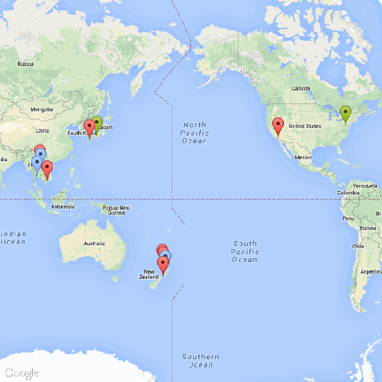 Зелёными я обозначил зашифрованные сети, красными – открытые. Синими – неизвестные. Каждый маркер на деле показывает на какое-то определённое здание. Сразу можно понять, что человек, скорее всего, живёт и работает на восточном побережье США (несколько маркеров), летает в Японию (маркер зашифрованной корпоративной сети) и отдыхает в Таиланде (сети с именами отелей), а также ездит по Новой Зеландии (сети с названиями кемпингов). Из названия корпоративной сети можно вычислить название компании.