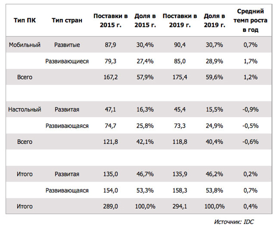 По оценке компании, в 2015 году на мировой рынок будет поставлено 167,2 млн мобильных и 121,8 млн настольных ПК. Первые займут 57,9% рынка в количественном выражении, вторые — 42,1%. На страны с развивающейся экономикой в 2015 г. придется 53,3% всех поставок ПК, остальные 46,7% — на развитые государства.