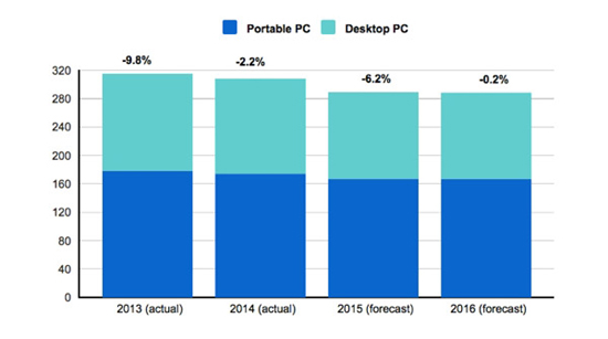 Эксперты в один голос говорят о существенном сокращении рынка персональных компьютеров. Выход новой операционной системы Windows 10, по мнению IDC, не спасет падающий рынок PC. Мировые поставки персональных компьютеров в 2015 году снизятся на 6,2% по сравнению с 2014 годом до 289 млн штук. В то же время продажи Mac продолжают расти: объемы реализации компьютеров Apple в I квартале 2015 года выросли на 2%.