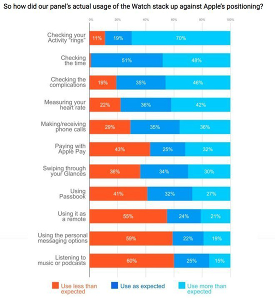 А вот функциями удаленного контроля, сообщениями, прослушиванием музыки больше половины владельцев пользуется реже, чем ожидалось. Всего же, по оценкам аналитиков, Apple Watch с апреля этого года удалось захватить 19,9% рынка носимых устройств.