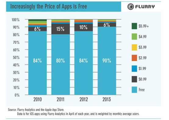 Из отчета следует, что за несколько прошедших лет доля дорогих (и покупаемых) приложений в процентном соотношении уменьшилась, а бесплатных, напротив, увеличилась в 2013 году до 90% от общего количества. На втором месте по популярности — программы стоимостью до 99 центов. Годом ранее бесплатные приложения занимали 84% исследованного рынка, стоимостью до 99 центов — 10%.
