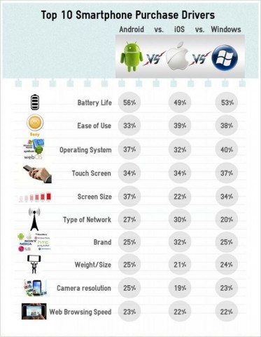 Представитель аналитической компании IDC Франциско Джеронимо провёл исследование, благодаря которому были выявлены основные критерии при выборе пользователями новых смартфонов. Владельцы устройств на базе Android, iOS и Windows Phone при приобретении нового гаджета в первую очередь обращают внимание на время автономной работы устройства: данный фактор стал решающим для 56%, 49% и 53% пользователей соответственно. Следом идёт простота использования смартфона, которая важна 33% владельцев Android-устройств, 39% iOS-пользователей и 38% владельцев Windows Phone-смартфонов.