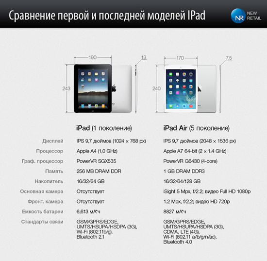К сегодняшнему дню Apple выпустила iPad, iPad 2, The New iPad, iPad 4, iPad Air, а также iPad mini и iPad mini с дисплеем Retina.