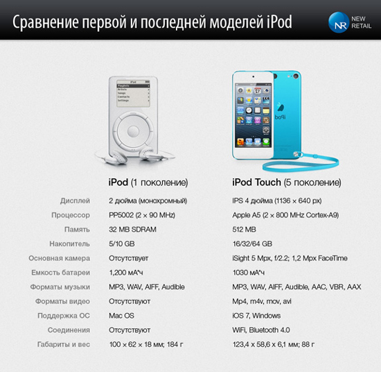 Первый iPod был представлен в 2001 году и был бледной тенью его младшего брата, который появился на свет в мае 2013, — iPod touch пятого поколения.